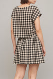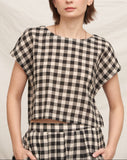 Chic and effortless, the Gingham Crop Top features a classic black-and-white check pattern in a relaxed, boxy silhouette. With its cap sleeves and cropped length, it pairs perfectly with matching Gingham skirts or high-waisted bottoms for a coordinated look.