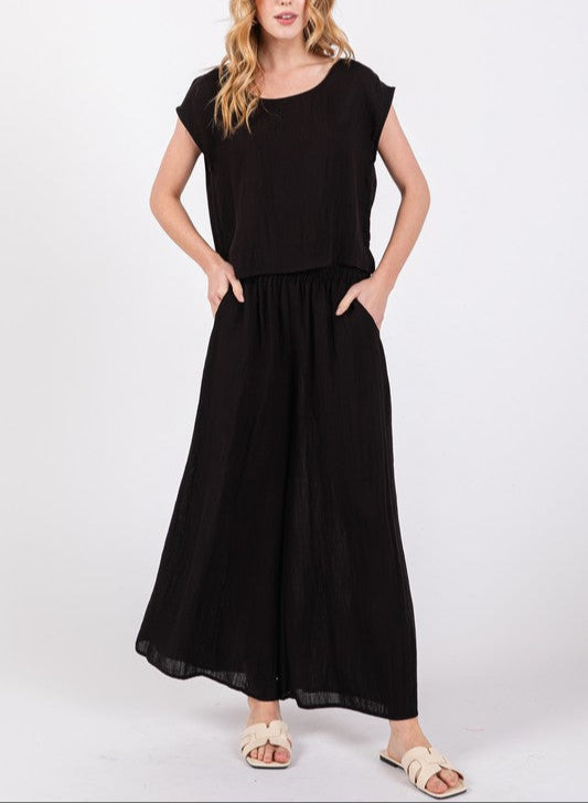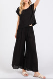 This set features a woven boxy top with extended sleeves and a round neckline and woven wide leg pull on pants. A great summer essential!
