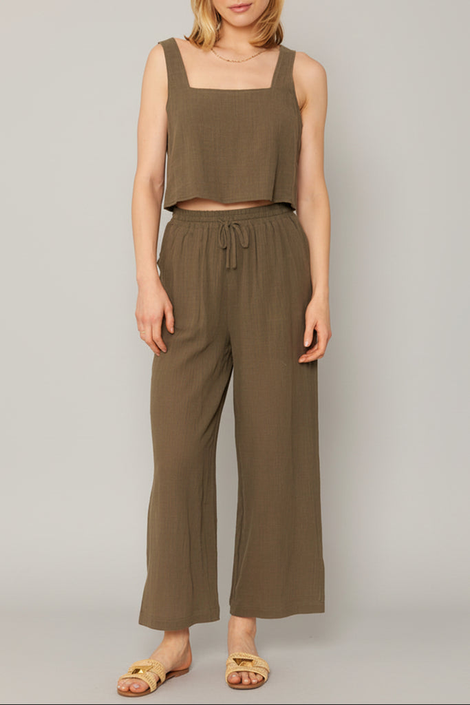 Effortlessly refined and endlessly comfortable, the Olive Estate Set is your go-to for warm days and laid-back moments. Designed as a matching two-piece, this set pairs a breezy cropped tank with relaxed wide-leg pants for an elevated yet easy silhouette in a timeless olive hue.