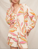 Lightweight and effortlessly polished, the Tropical Brushstroke Button-Up Top features a soft, flowy fabric with an artistic leaf print in warm, vibrant tones. Designed with a relaxed fit, long sleeves, and a classic button-front silhouette, this versatile piece can be worn on its own or styled with matching Island Leaf shorts or neutral bottoms for an easy, elevated look.