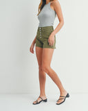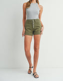 Army Girl Button Front Denim High Waisted Shorts in Olive