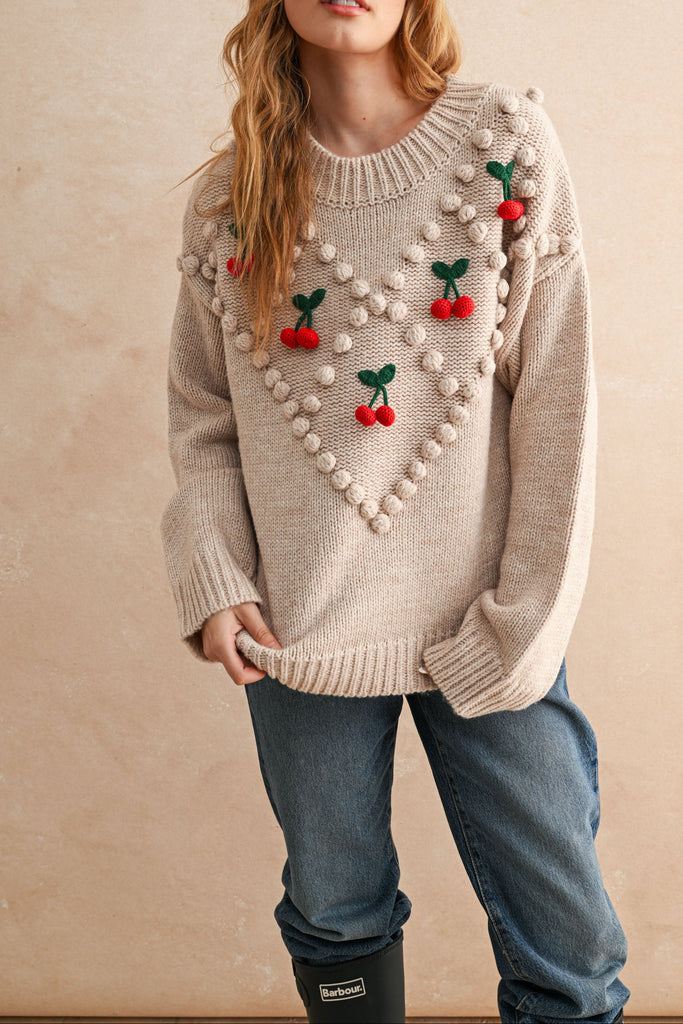Wrap yourself in warmth with this delightfully cozy sweater featuring a charming cherry trim detail. The soft oat-colored base pairs perfectly with pops of cherry red, creating a look that's equal parts sweet and stylish. Perfect for layering on crisp autumn days or pairing with your favorite jeans for effortless comfort. A playful piece that brings a little fruity fun to your everyday wardrobe.