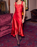 Be the talk of the town in the Red Heat Slip Dress! This fiery asymmetrical dress features delicate lace trim and a luxurious satin material for a statement look. Whether you're sizzling at a party or turning heads on a date, this dress will have you feeling hot, hot, hot!