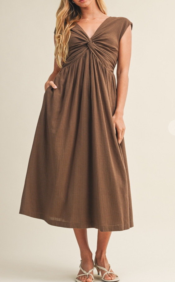 Effortlessly chic and undeniably fun, the Willow Twist Midi Dress brings movement and personality to your everyday rotation. The twisted front detail creates flattering dimension while the flared midi silhouette skims beautifully. Best of all? Functional pockets keep your essentials close without sacrificing style. Perfect for brunch, casual outings, or whenever you want to feel put-together with zero fuss.